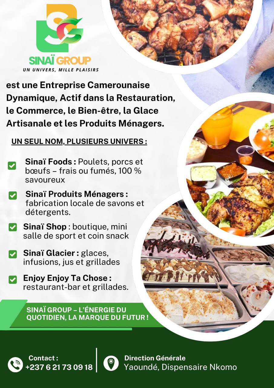 Chez Sinaï Group, nous ne visons pas seulement la réussite : nous incarnons l’excellence dans chaque détail. Notre force, c’est cette alliance rare entre le savoir-faire local et une vision moderne du monde. Chaque projet que nous portons est conçu, développé et affiné avec une rigueur qui reflète notre amour du travail bien fait. De la cuisine à la boutique, du produit ménager au service client, rien n’est laissé au hasard. Nous croyons que le Cameroun possède des talents, des saveurs et des idées qui méritent de briller à grande échelle — et c’est notre mission de les mettre en lumière. Notre excellence, c’est notre signature. Notre inspiration, c’est notre terre. Et notre fierté, c’est de prouver qu’un groupe Camerounais peut rivaliser avec les plus grands, sans jamais perdre son âme.